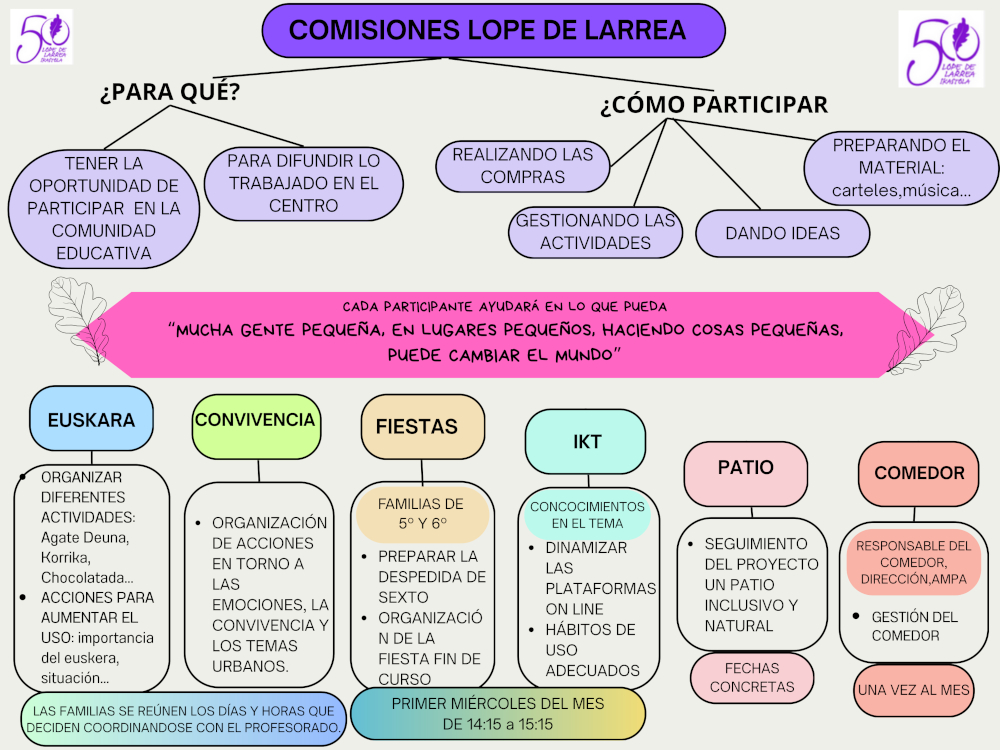 De estas comisiones sale la organización de fiestas como Santa Águeda, la propia fiesta de la ikastola, las actividades contra el vandalismo y a favor de la interculturalidad, todas las mejoras realizadas en el patio y esta página web.
